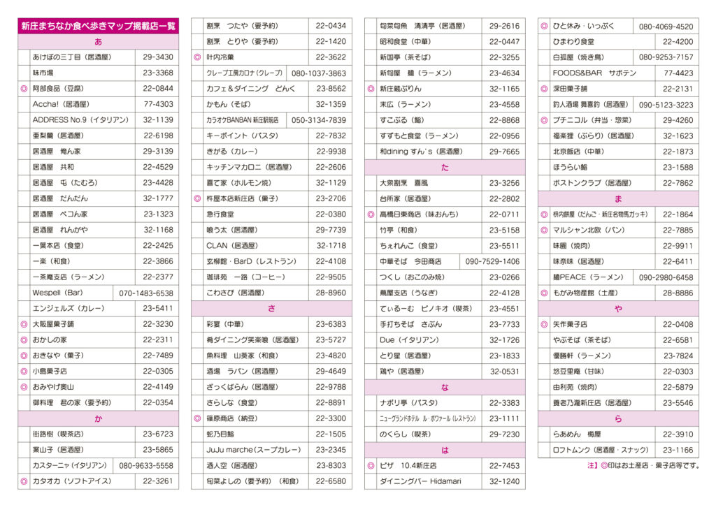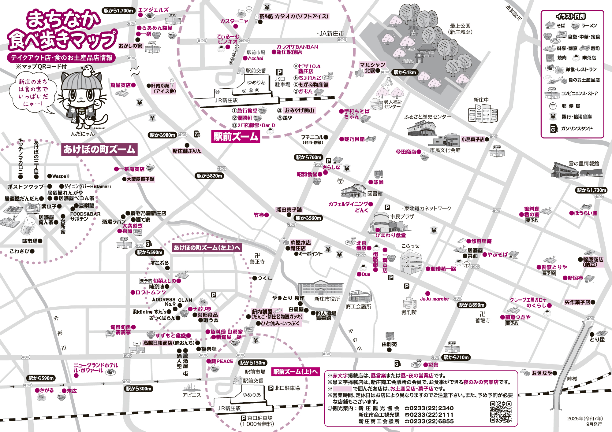 新庄駅前から約2キロ以内にあるランチのお食事(そば、ラーメン、食堂・中華定食、料亭・割烹、寿司、焼肉、喫茶店、洋食・レストラン)や夜間営業の居酒屋、食のお土産店、テイクアウト店・菓子店等々かわいいイラスト凡例で紹介しているまちなかの食情報満載「まちなか食べ歩きマップ」です。新庄市マスコット「かむてん」がご案内しております。